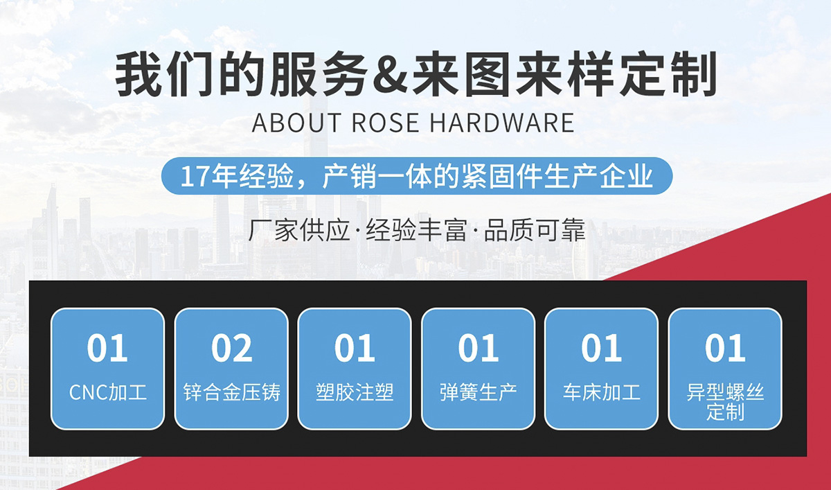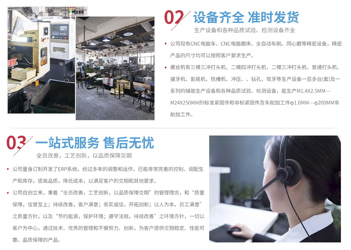 主要生產非標件(止付螺絲、自攻牙螺絲、木牙螺絲、機械牙螺絲、加長螺絲、高強度螺絲、螺桿、軸、銷等)和標準件(國標、美標、德標、日標、英標等)。
